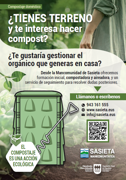 Si tiene un terreno, puede hacer compostaje doméstico. Sasieta Mankomunitatea les ofrece de forma gratuita un compostador, la formación y el material necesario para compostar.