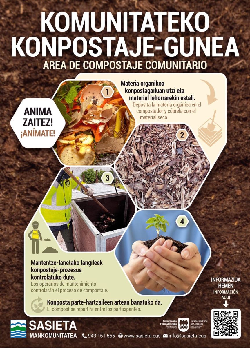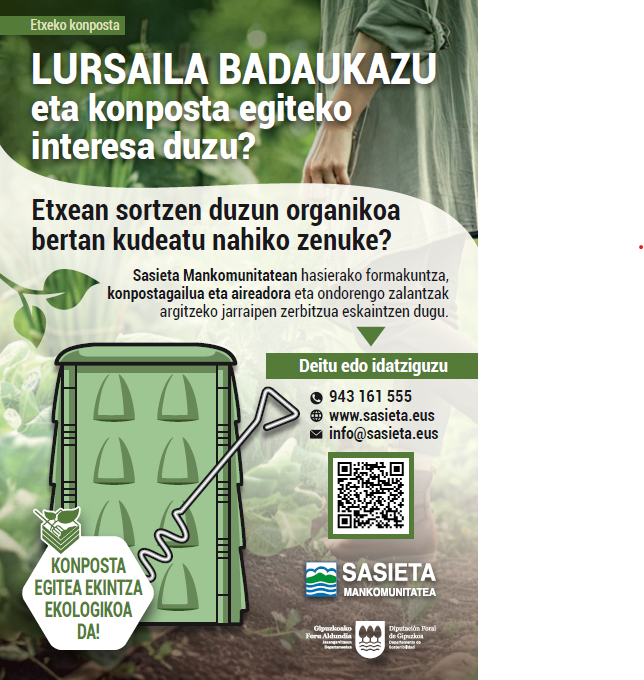 ETXEKO KONPOSTA: Lursail bat baduzu, etxean konpostatu dezakezu. Sasieta Mankomunitateak formakuntza, konpostagailua eta beharrezko materialak emango dizkizu.